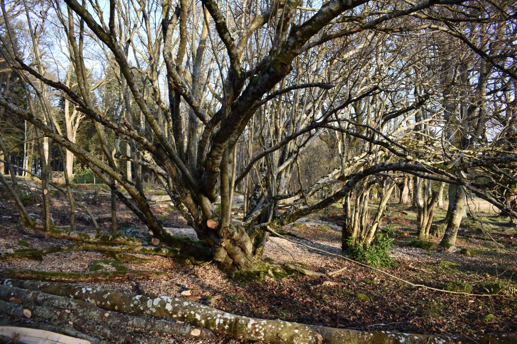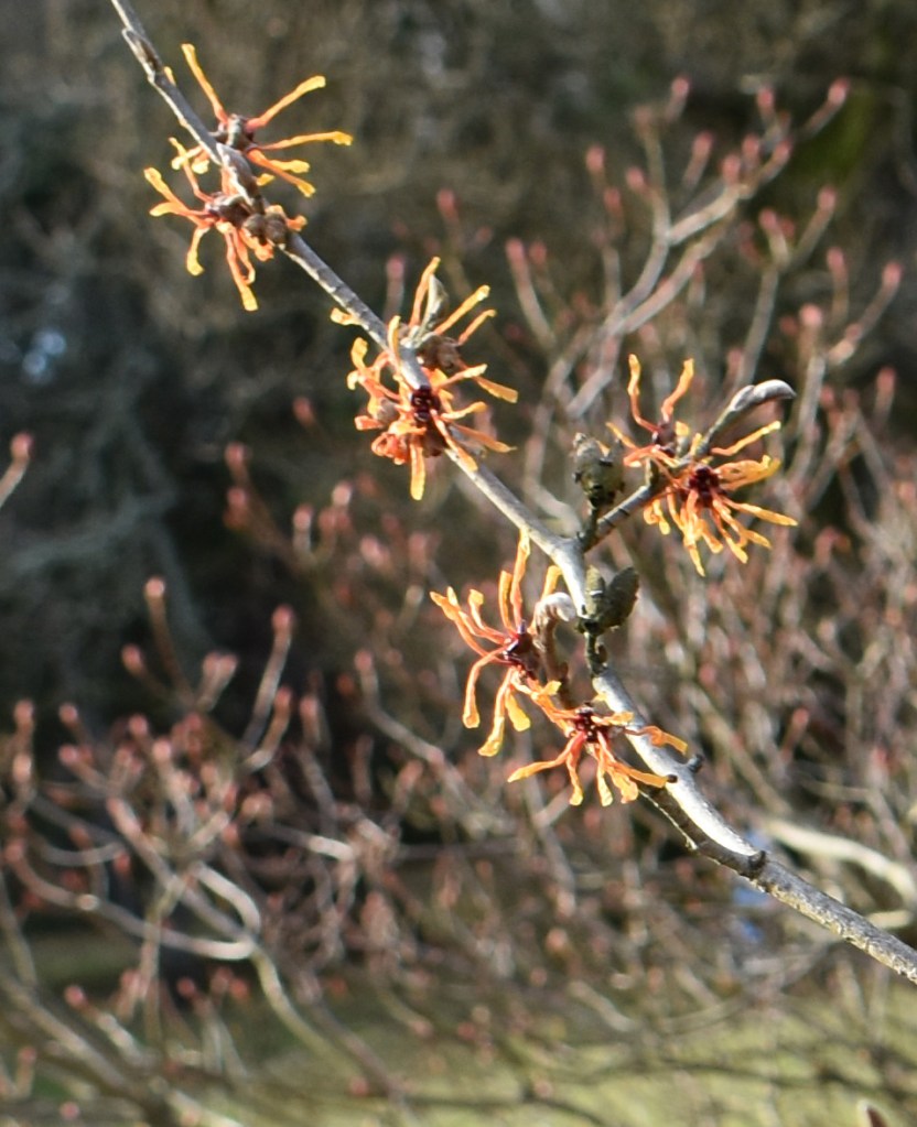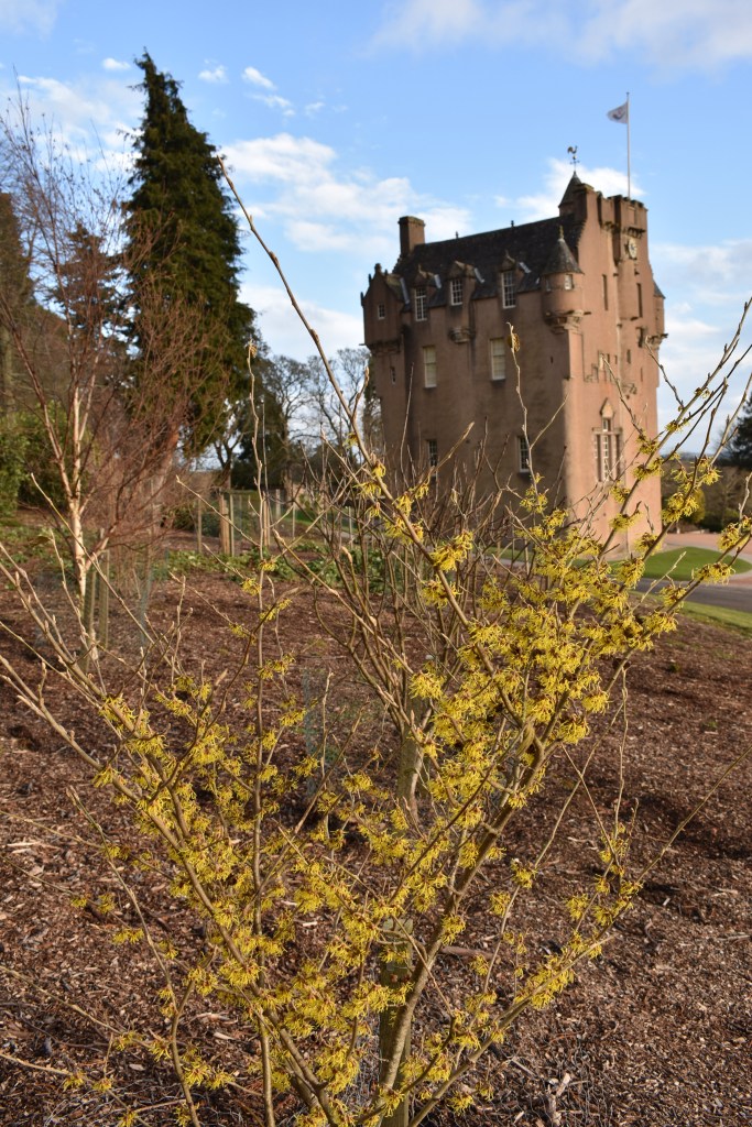 If you are walking the trails when the Walled Garden is closed take time to visit the viewpoint near the castle. This area is now beginning to develop nicely. There are a variety of witch hazels to see; Hamamelis x intermedia ‘Rubin’, H. x intermedia ‘Aphrodite’, H. x intermedia ‘Arnold Promise’, and (I think) H. x intermedia ‘Pallida’. If you bring a flask of coffee and use the seating area you can enjoy the gloriously scented group of Daphne bholua ‘Jacqueline Postill’.