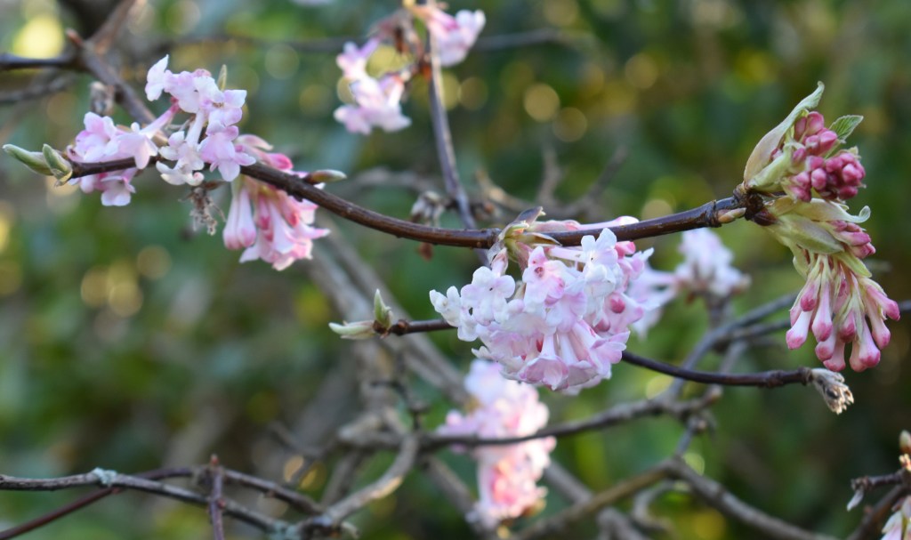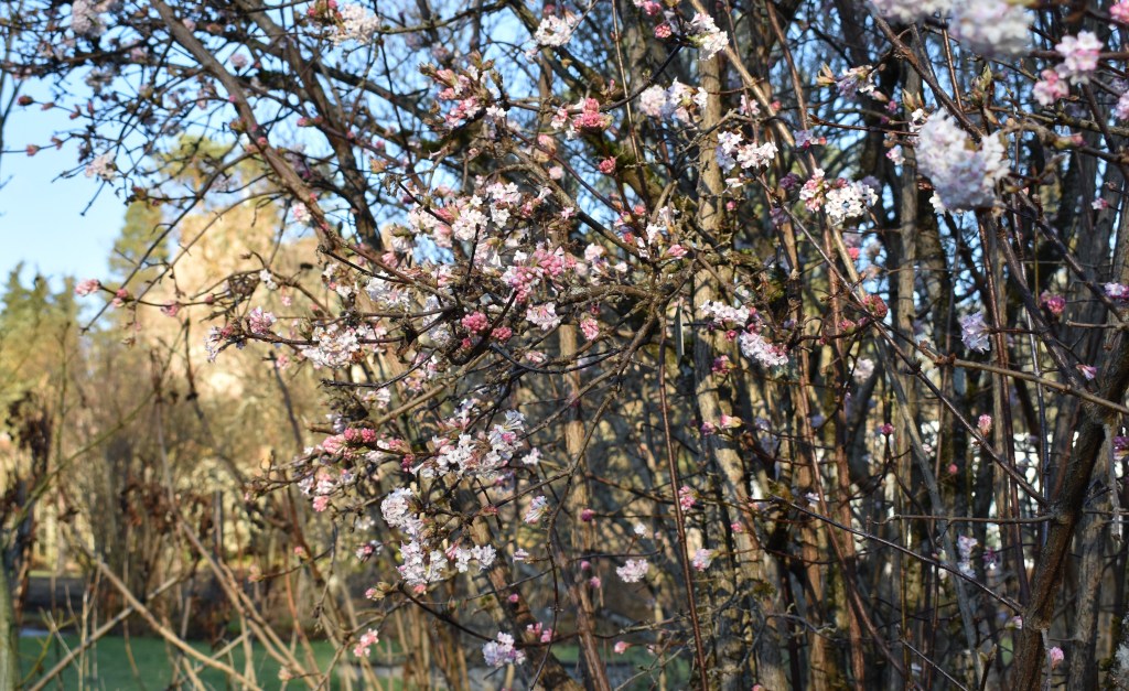 Viburnum x bodnantense ‘Charles Lamont’ is looking good in this mild weather. Although it doesn’t mind the snow the flowers can turn brown with a sharp frost. Charles Lamont was an assistant curator at the Royal Botanic Garden Edinburgh (RBGE). In 1933 he was experimenting with crossing Viburnum grandiflorum with Viburnum farreri (previously V. fragrans). He didn’t think much of the results and chose not to proceed with the experiments. Meanwhile at Bodnant Gardens near Colwyn Bay in Wales, the head gardener, Frederick Puddle, was doing similar experiments but with satisfactory results – thus the name of the hybrids we know as bodnantense viburnums. Bodnant Gardens developed the cultivar ‘Dawn’, and later Notcutt nurseries marketed ‘Deben’. The plants produced at RBGE were given Charles Lamont’s name. We have all three cultivars at Crathes and their parents, but I rely on the labels to tell the cultivars apart. Deben is said to be white when in flower; the Crathes ‘Deben’ is pink. Pete Brownless of RBGE thinks that ‘Deben’ plants may be pinker in the north because of the colder climate.