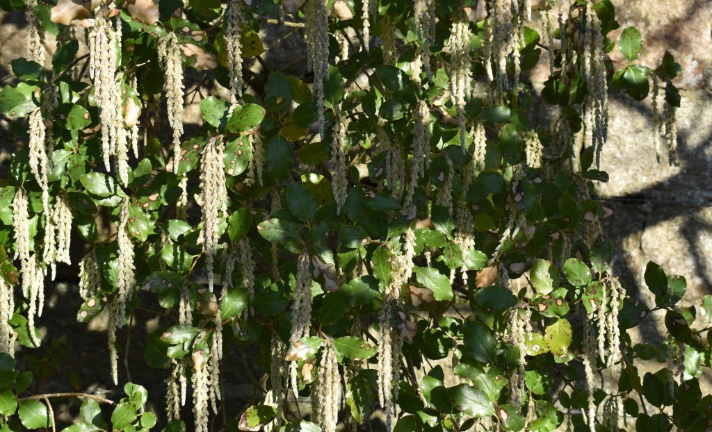Garrya elliptica is another plant that Menzies discovered and Douglas introduced to Britain. It is in flower at the moment in the Fountain Garden. The tassels are said to be longer in male plants (the Crathes plant is a male), but shorter in colder climates. Apparently in Cornwall the tassels can be up to a foot long.