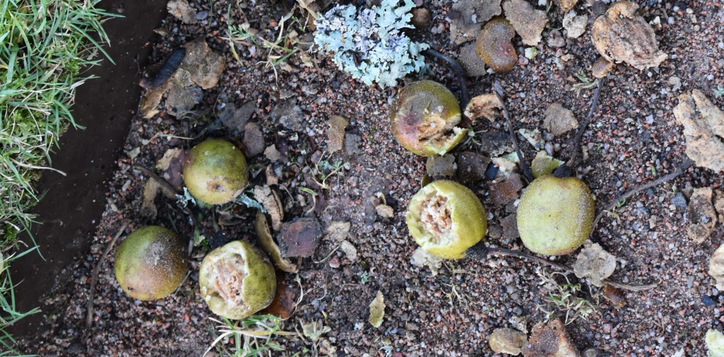 The volunteers have been busy weeding in the Double Shrub Border where a cocky blackbird was enjoying the fallout from the disturbed soil. Other blackbirds are busy feasting on the thousands of fallen handkerchief tree fruits (Davidia involucrata) in the Rose Garden and gardeners’ yard. It is only in January that the fruits become soft enough for the birds eat. The blackbirds and fieldfares are also fond of arbutus fruits.