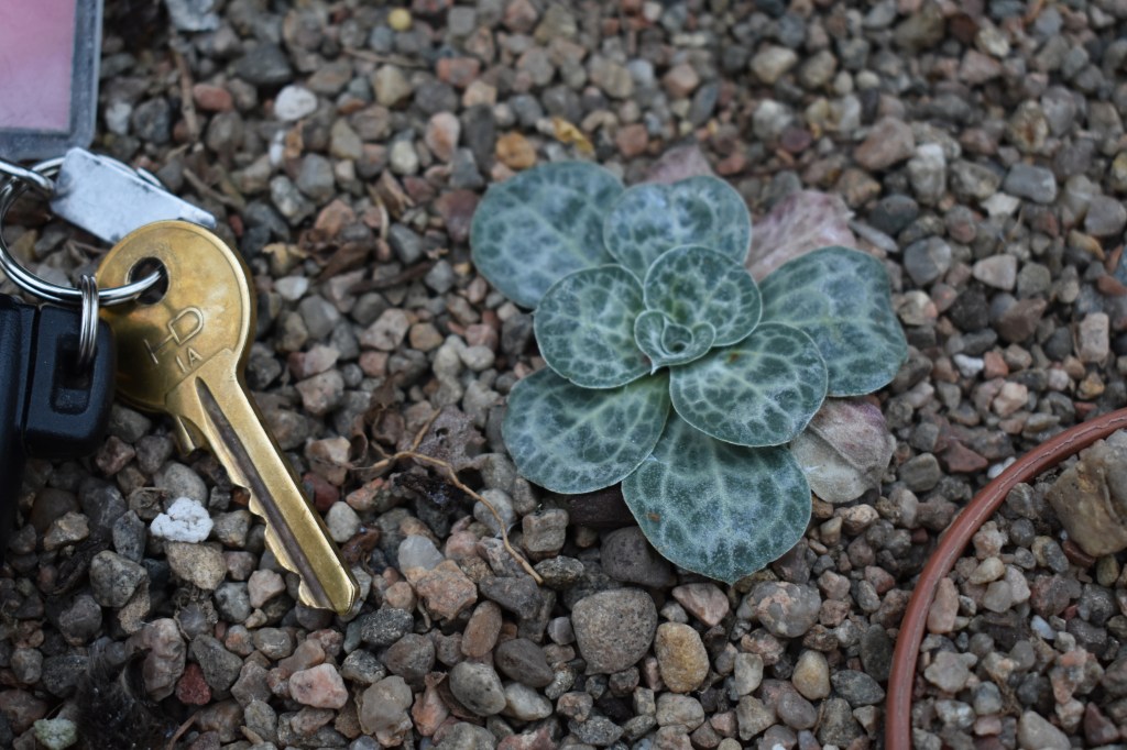 A. tabuliforme is endemic (found only) to Tenerife where it prefers a damp north-facing rocky environment. One of the other aeoniums in the glasshouse was just coming into flower in March. The flowers in both these aeoniums are reminiscent of the biting stonecrop, Sedum acre, – they and the sedums are of the family Crassulaceae. Also of Crassulaceae is Echeveria derenbergii, photographed by Joanna just before the lockdown. Bukiniczia cabulica is an attractive little succulent of the Plumbaginaceae family. It flowered in 2017 and self-seeded – appearing last year. It is taking its time to grow, but when it does flower it will die.