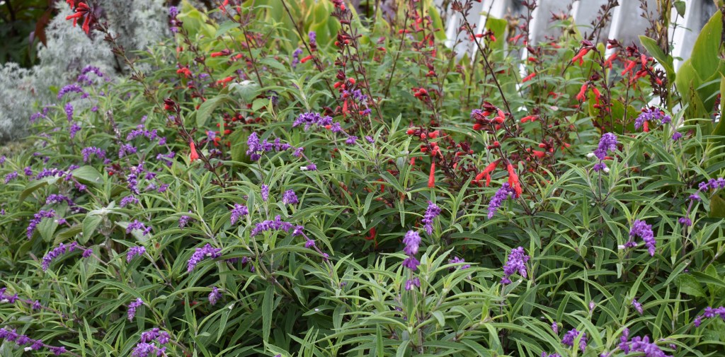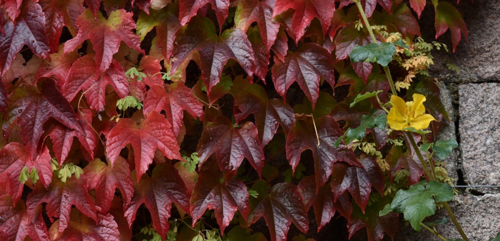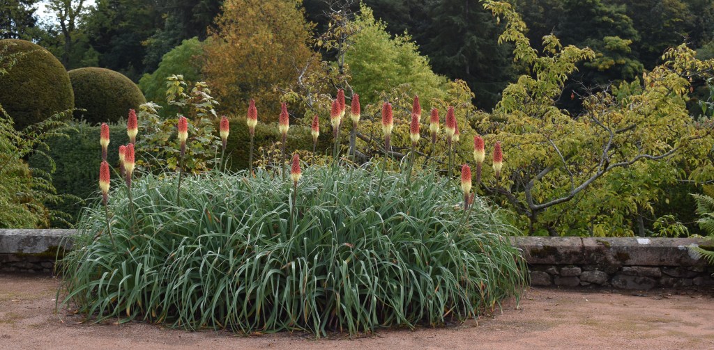 In the Upper Pool Garden there was much to enjoy with rudbeckias and salvias standing out against the purple cotinus leaves. The Kiphofia caulescens made a show in the gravel paths. The Fremontodendron californicum produced flowers throughout the summer, its yellow and green now contrasting with the many shades of red on the Virginia creeper, Parthenocissus (tricuspidata – I think). Thinking of the frosts to come, I remember David Maclean, who was head gardener at Crathes during the 1980s and early 1990s, saying that he rather liked the way the plants in the Crathes garden could sleep during the winter, whereas at Dunvegan, on Skye, the plants never got a break.