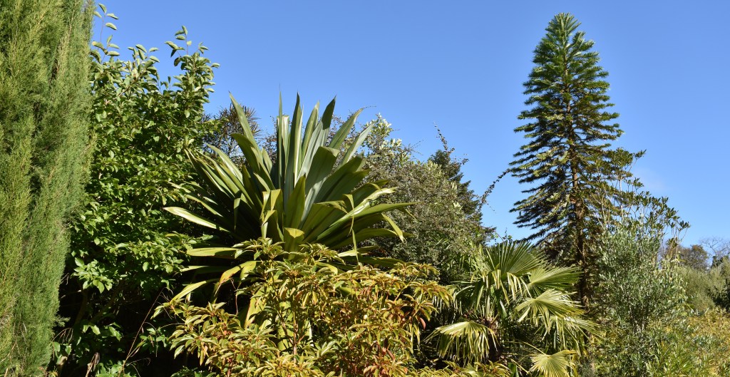 The rare Wollemi pine with its tall thin outline was particularly noticeable. This pine, Wollemia nobilis, a plant surviving from the time of dinosaurs and related to the monkey puzzle tree, was unknown to the botanical world until 1997 when about a 100 mature pines were discovered in a gorge in the Blue Mountains, about 200 km from Sydney, Australia. During the recent forest fires, particular effort was made to circle the gorge with a ring of fire deterrent irrigation. Just as with the dawn redwood, Metasequoia glyptostroboides, (discovered in the 1940s) there has been a massive effort made to distribute seeds and plants throughout the world in order to preserve the species.