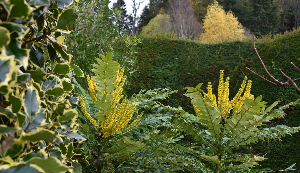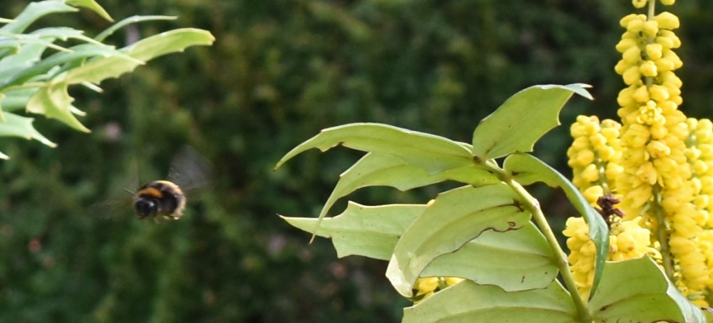 It’s easy to forget about the Mahonia lomariifolia because it’s hidden away in the Yew Borders. It’s the most tender of the mahonias and a frost is quite likely to spoil it before I get round to looking for it. So I was doubly pleased this week to catch it in full flower with attendant bumblebee. The bee is probably a buff-tailed bee, Bombus terrestris, since the other bumblebee species should be hibernating by now; indeed it is unusual to see any bumblebee in the North-East of Scotland during November. In the south of England B. terrestris is active throughout the winter. Maybe global warming?