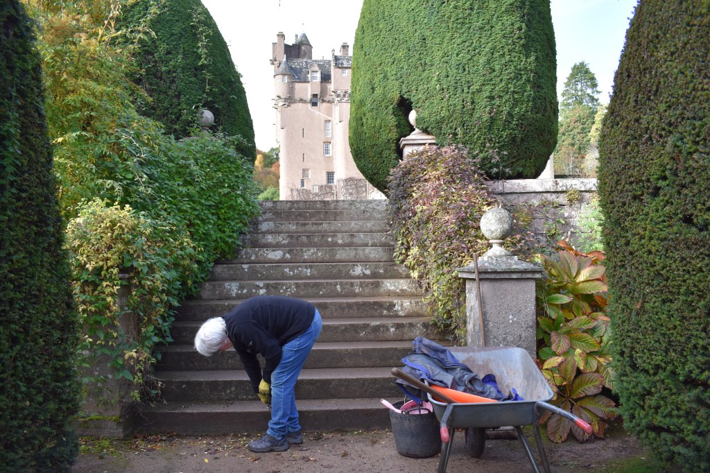 Steve and Tim have been removing rincinus and cannas from the beds beside the glasshouses. The cannas will go inside; the ricinus can be grown afresh from seed. The salvias will be left until the frost cuts them back. Volunteers have been tidying up too – Sandra on the steps and by the Doocot; Sheila and Janice clearing away the jungle in the Evolution Garden. James has got tied up with old drain problems in the castle which surface in the garden. He has spent some time barrowing soil out of a crucial drain trap that had been long lost and neglected.