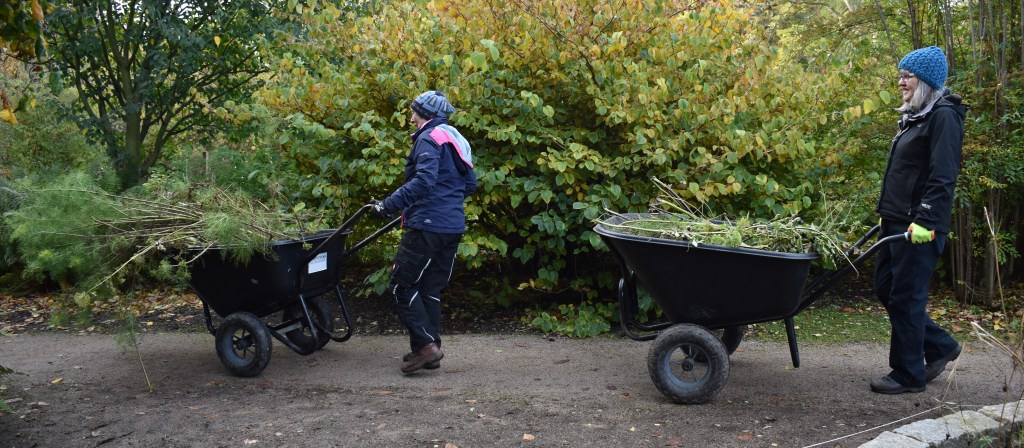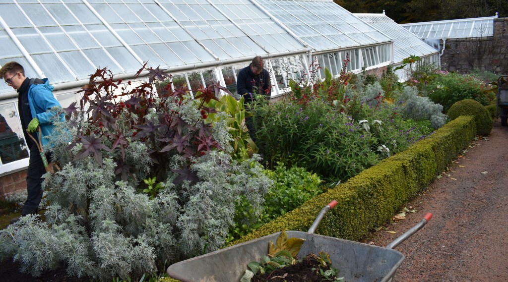 The gardeners have fixed up a protection for the Echium pininana. Steve has sorted the Woodland Garden pond which was leaking and had to be drained (the sludge was left) and repaired – it is an old pond. It has now filled up with rain water and the wildlife will have recovered. The herbaceous beds are being cut back and tender plants are removed to the glasshouses where appropriate. Some plants are left to ease the eye from the bare ground; others are left because they need to be split and replanted for next year.