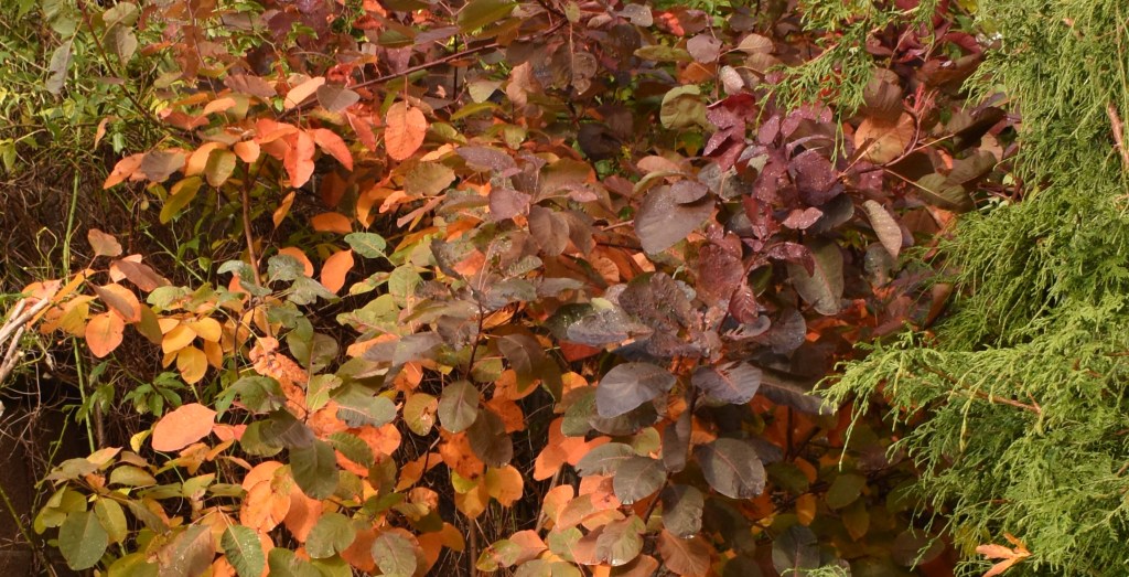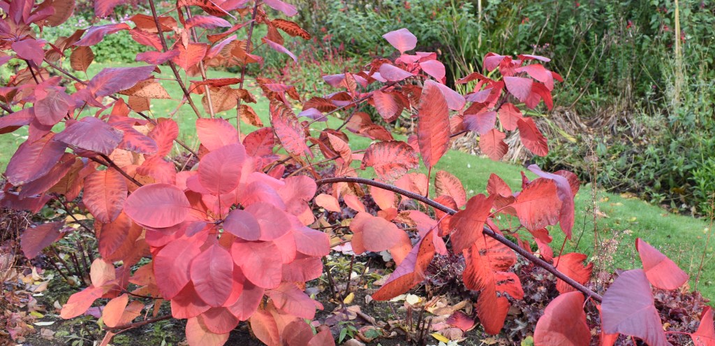 I have a lot of photographs of cotinus leaves – they almost seem to glow as the dark maroon colour fades. The cultivar ‘Grace’ has an orange tint especially in the autumn. Cotinus looks especially good in front of the Eucryphia glutinosa which has also taken on its autumn hue. The evergreen Eucryphia rostrevor still has a few flowers.