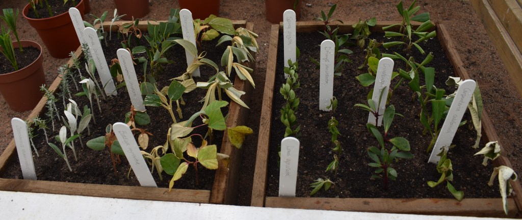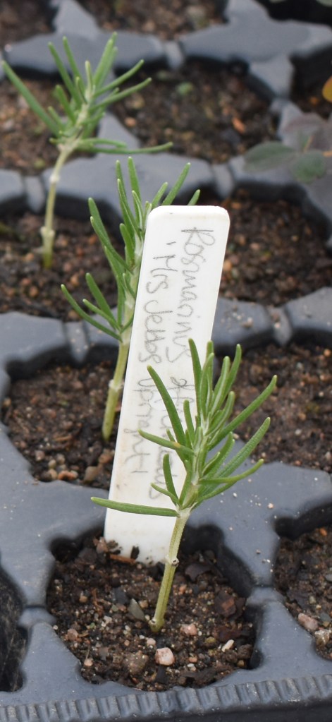 Joanna has been cleaning glasshouse one with help from Andy. The cuttings keep on coming. I note a rosemary cutting labelled ‘Mrs Jebb’s upright’ and wonder who Mrs Jebb is. She is not easy to find, but I discover that there is a garden called Brooklands between Dumfries and Castle Douglas. The estate, originally 1830, was bought by Brigadier and Mrs Jebb in 1947. The Jebbs restored the gardens and policies. Mrs Jebb died in 1968 but I could find nothing further about her. The garden is sometimes open to the public in the Scotland Garden Scheme. The rosemary is more delicate than the usual Rosmarinus officinalis – I’ll be looking out for the colour of the flowers. For enthusiasts I list the names of cuttings shown below, left to right, front to back: Ozothamnus rosmarinifolius, Corokia buddlejoides, Correa backhouseana, Cinnamomum camphora, Buddleja myriantha, Stachyurus praecox, Luma apiculata, Spirea aguta, Drimys lanceolata, Crinodendron patagua, Carpenteria californica. All are from the Aviary Terrace and mostly tender.