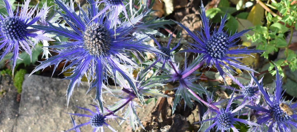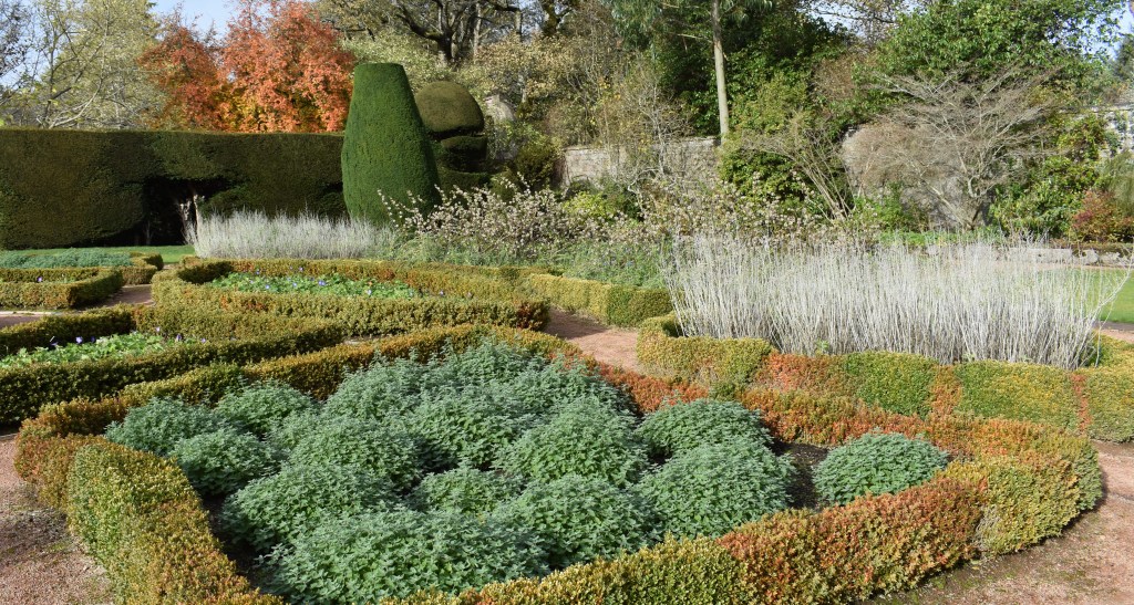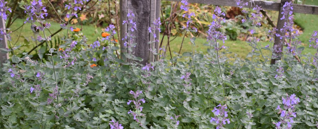 With the frosts holding off, the garden offers plenty of colour combinations to cheer our spirits. The oranges, yellows and reds of the turning leaves remain dominant, but a few blue flowers can still be found. The nepeta beside the trellis that was cut back on 21 July has been re-flowering for a few weeks now. The nepeta in the Fountain Garden that was cut only a week or two later never produced any more flowers, but it looks equally good filling the parterre with mounds of blueish foliage. Both were cut back hard in the spring to delay the first flowering because the garden was closed. The Salvia corrugata at the top end of the Four Squares is thriving, and some of the electric blue eryngiums on the Blue and Pink Border readily catch the eye.