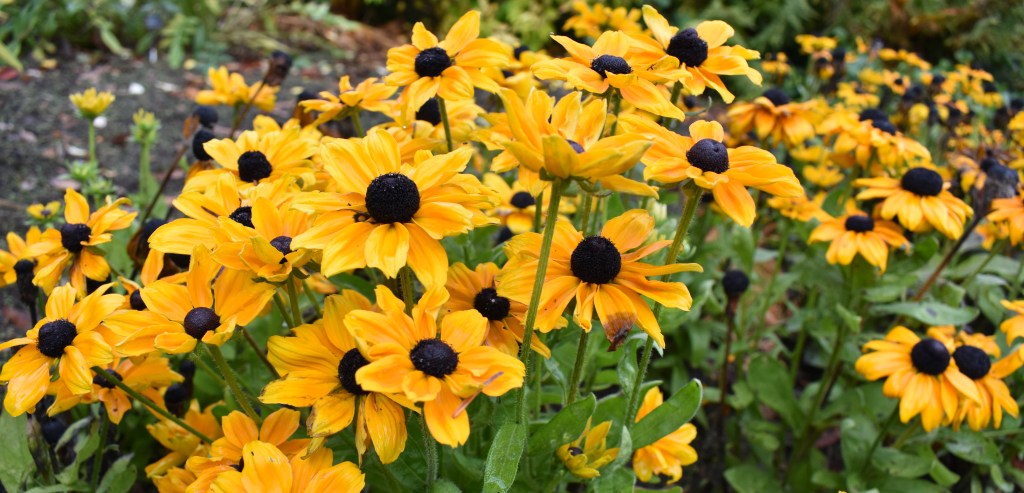 The dwarf, bright yellow Rudbeckia hirta ‘Toto Gold’ makes a good show in the Golden Garden. The whole corner is attractive with the yellowing leaves of Hydrangea petiolaris on the west wall and the soft brown of the dawn redwood, Metasequoia glyptostroboides ‘Gold Rush’.
