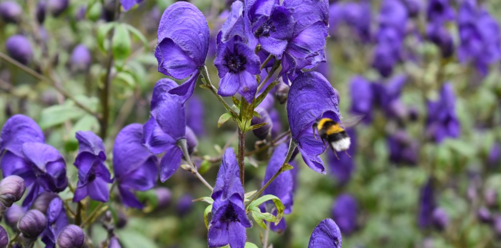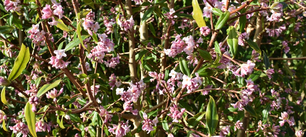 Section 1: January Daphne (Daphne bholua ‘Jacqueline Postill’); February Snowflake (Leucojum vernum); March Chionodoxa; April Flowering currant (Ribes sanguineum); May Peony (Paeonia mlokosewitschii – Molly the Witch – grows happily at Crathes, but some say it is difficult to grow) June Oriental poppy (Papaver orientale); July Rosa ‘Mundi’; August Monk’s hood (Aconitum napellus); September Butterfly bush (Buddleia x weyeriana ‘Sungold’); October Michaelmas daisies; November Mahonia (Mahonia lomariifolia); December Viburnum (Viburnum x bodnantense ‘Deben’)
