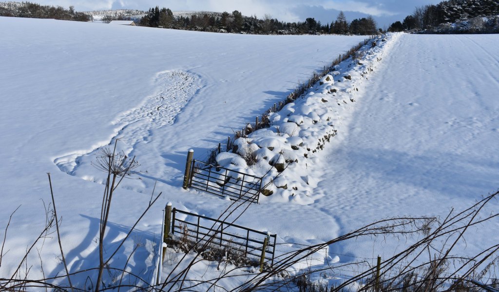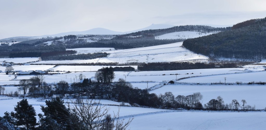 The snow is deep on the hill and I am glad to walk in someone’s footprints ‘where the snow lay dinted’. To the south I can see Clach na ben, to the east the Hill of Fare.