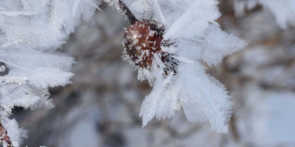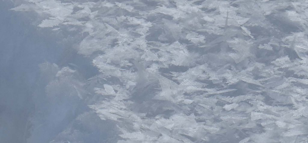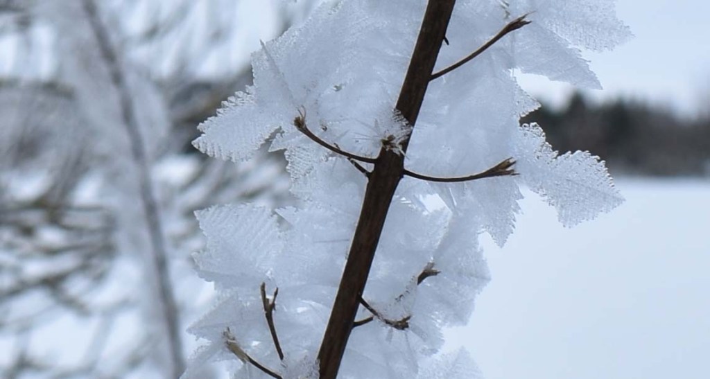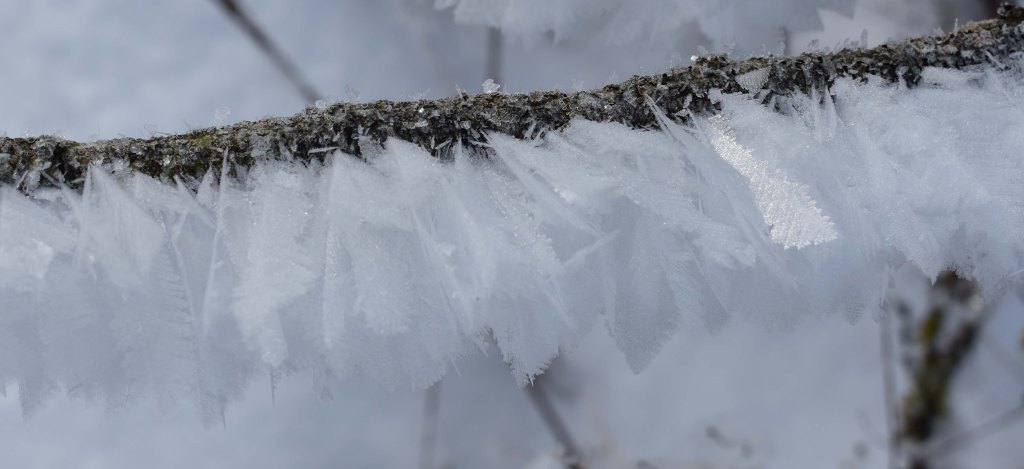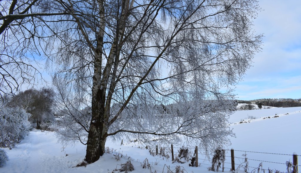 The 11th February is an extremely cold day – Braemar recorded minus 23 degrees Celsius overnight. The day begins with bright blue skies. At the end of the railway path I come upon some exquisite frost formations. They are quite bewitching, like fine glass leaves clustered on stems and branches. When the clouds chase away the sun the ‘leaves’ begin to fall all around me. As they lie there, still pristine in shape, I wonder at this brief and fragile beauty that I have been privileged to glimpse.