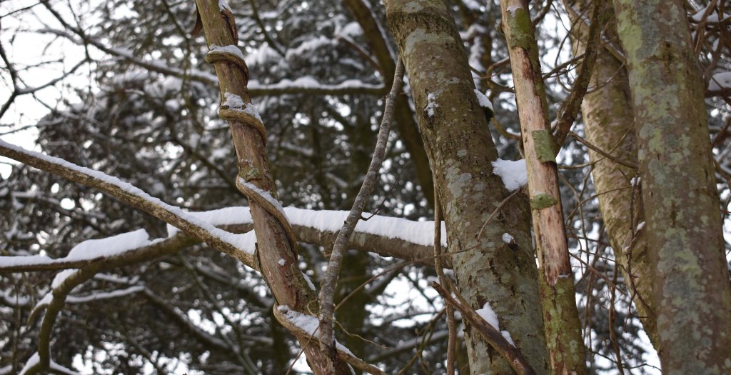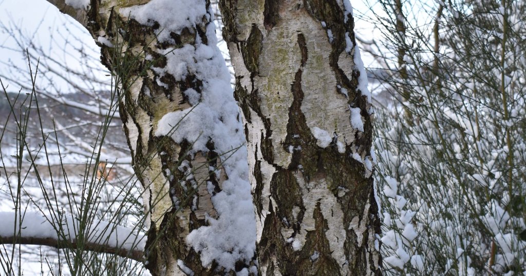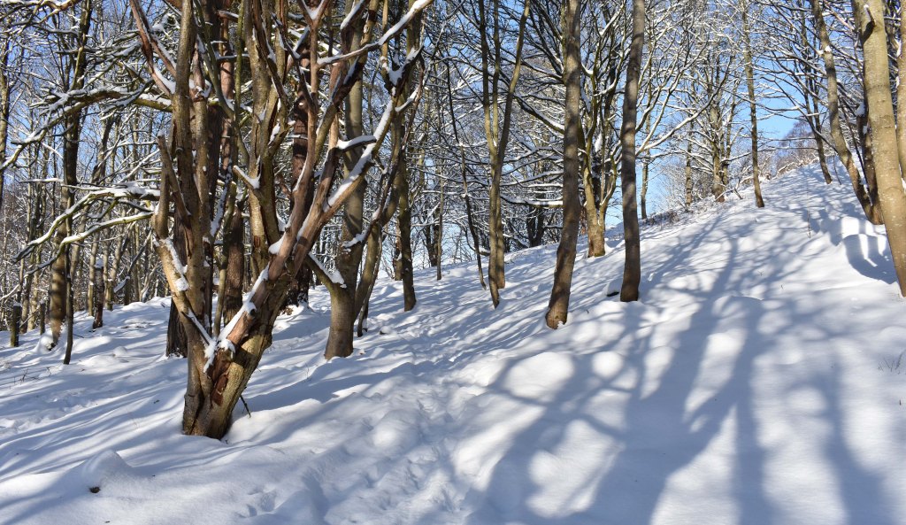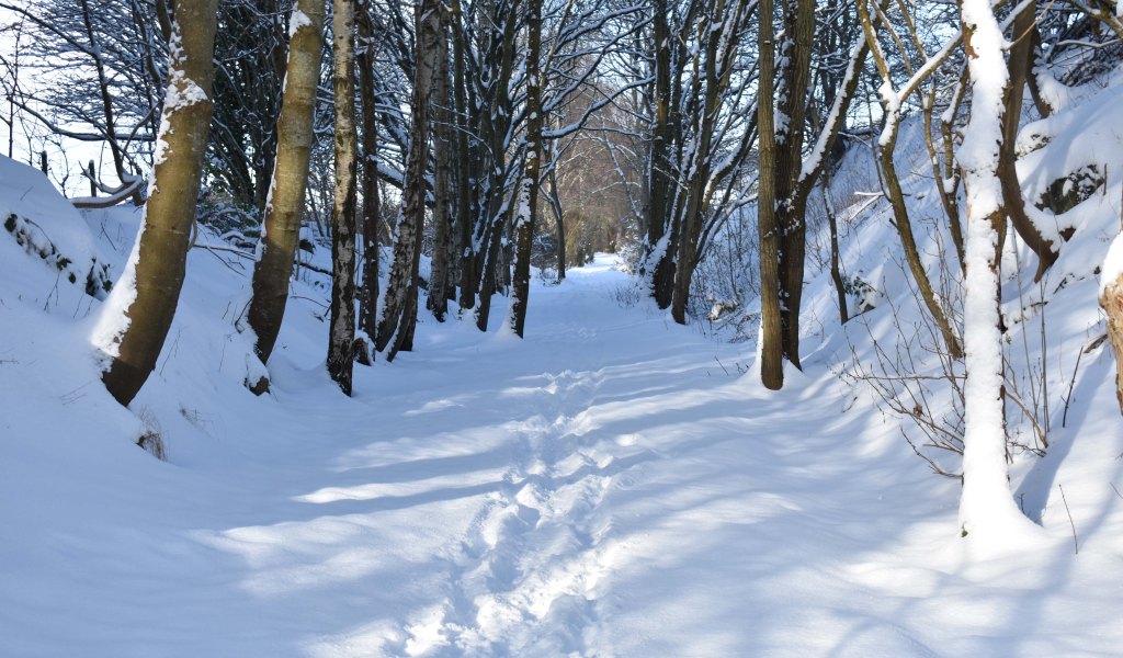 The line of the railway is accessible along the south side of the park and westwards for about a quarter of a mile or so. A good fall of snow has made the walking easy – no slipping today. Silver birch have grown up on either side of the path; the patterns on their bark look good throughout the year. I note the honeysuckle twining up a dead willow. The honeysuckle is not dead, its leaves are just beginning to unfurl. The sun comes out and lights up the scene; blue skies ahead.