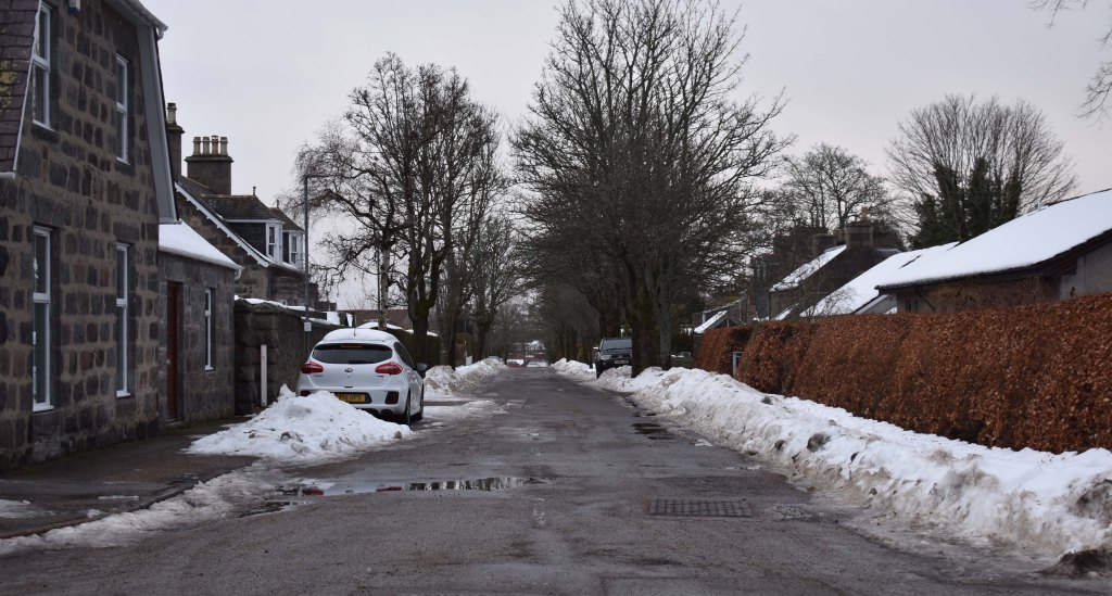 The Deeside line didn’t reach Torphins until 1866; in fact there was not much of a village before that – the OS map surveyed in 1866 shows the station, an inn, a post office, the old school (now standing derelict), some Home Farm cottages and a few more cottages in the Inchly area. Other than the Poorhouses, there are no houses to the north of the station. With the coming of the railway the Learney estate began to feu out plots for building, those on William Street being amongst the first to be granted, starting in 1876. Torphins, then, is really a railway town, now bereft. The railway went the way of other Beeching cuts and ceased to carry passengers a hundred years after its birth.