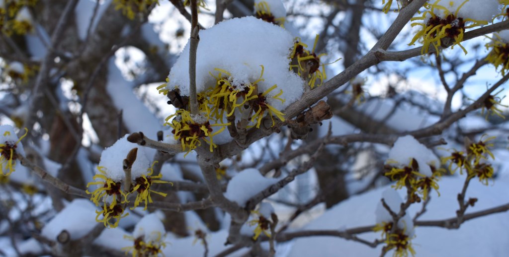 Just down from my house I can walk down Cooper’s Lane – we call it the tunnel – where Mr Cooper used to take his horses up to graze in the fields on which our house was built. Turning right I travel along Grampian Terrace stopping to admire the witch hazel, Hamamelis mollis, which grows in one of the gardens and does not seem to be bothered by the frost.