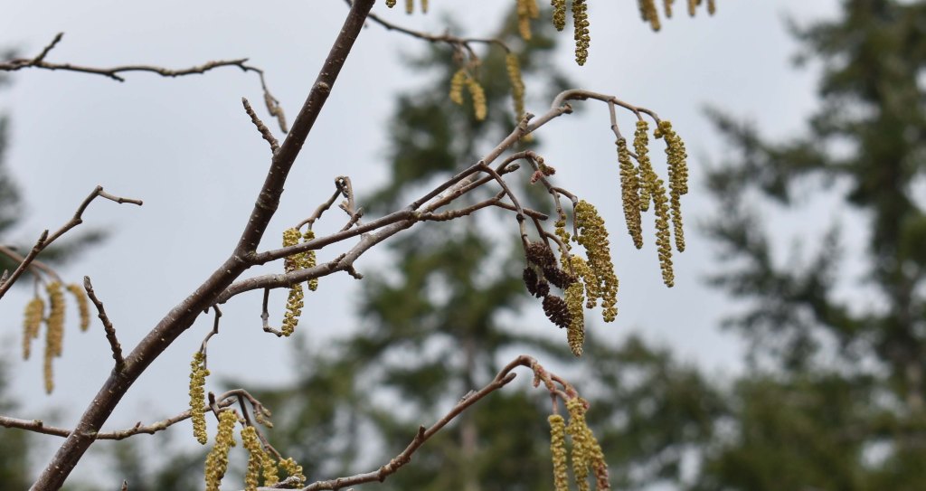 Not all the trees in the young pinetum are conifers. The catkins of an alder tree, Alnus rubra, I initially take for a hazel, until I see the female cones. A birch, Betula delavayi , is attractive for its pinkish flaking papery bark. A larch, Larix gmelinii var. olgensis, from north-east Asia (a deciduous conifer) is just coming into leaf.
