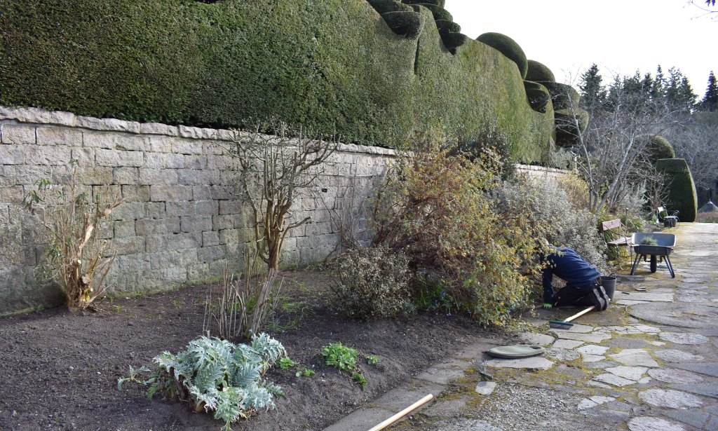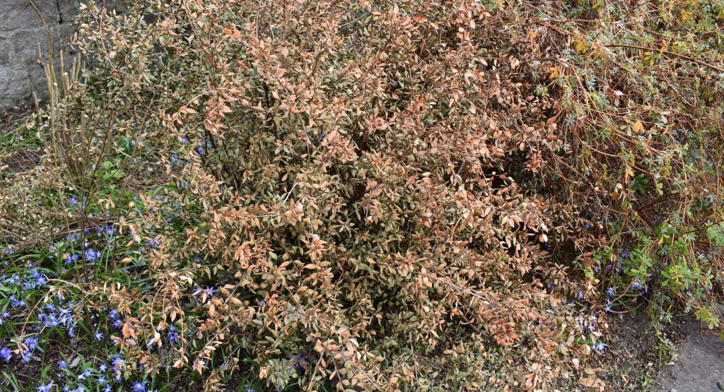 There was much activity on the Aviary Border when I visited last week. The cost had been counted and action was being taken. All the tender plants that had been damaged by the frost had to be cut back. The only positive aspect of this rather depressing affair was the fact that the wall is due for pointing and the funding has finally been arranged, so some cutback would have been needed anyway. But it was sad to look on the scene after the team had been at work. I was particularly upset to see that the Chilean guava, Ugni molinae, had been hit by the frost. I was so taken with this plant last year (see …purple and orange and blue. 8 November 2020) that I ordered one for myself and it is presently waiting to be potted on into a decent container.