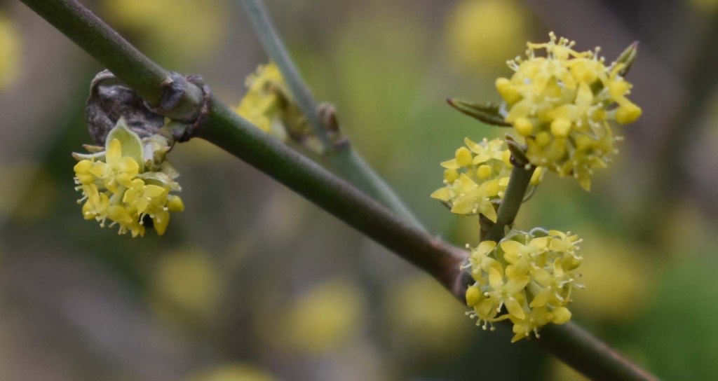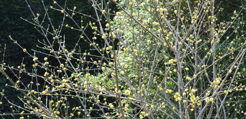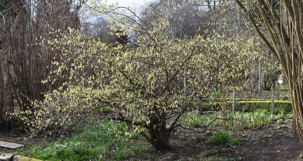 Another yellow flower that I have learned to love is the Cornelian cherry, Cornus mas. The tree on the Yew Border was cut back hard a few years ago, and is now putting on a show of the delicate and subtle sort.