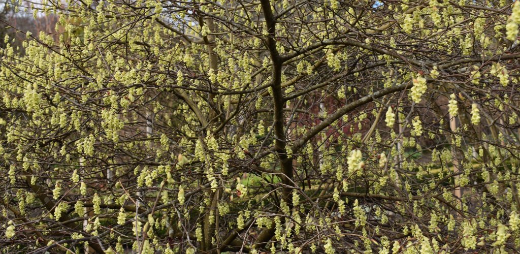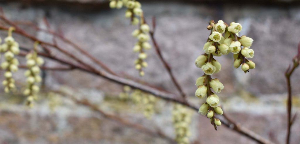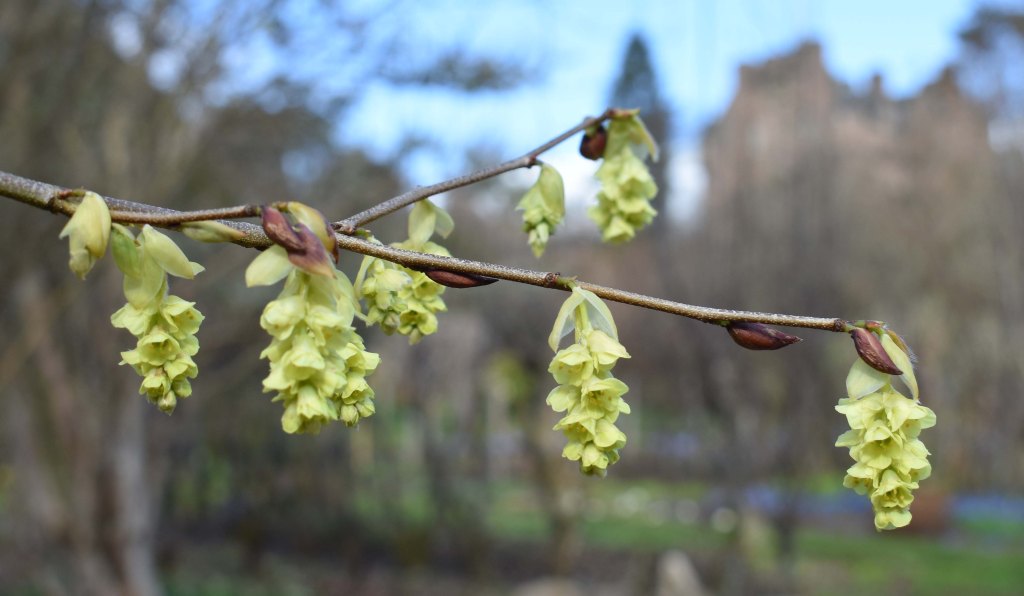The corylopsis that border the Evolution Garden are now coming into flower. Their scent complements the lovely inflorescence.