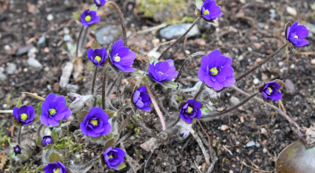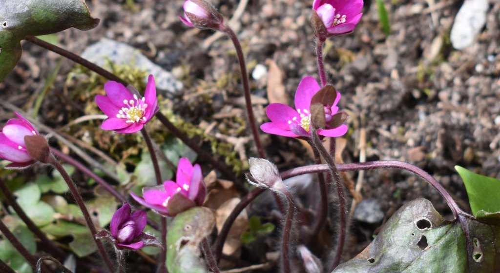 A real speciality, growing on the South Border beside the Woodland Garden gate is Hepatica x media ‘Millstream Merlin’. Some nurseries suggest its parents are H. nobilis and H. transsilvanica (shown in my last post). H. nobilis ‘Rubra’ grows in the Doocot enclosure.