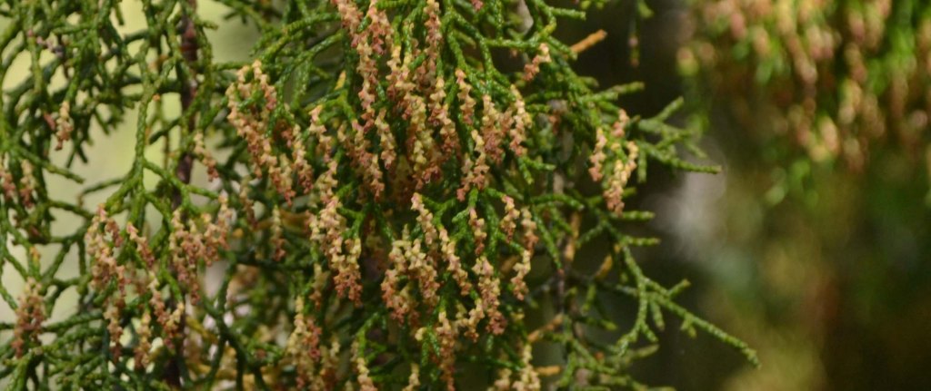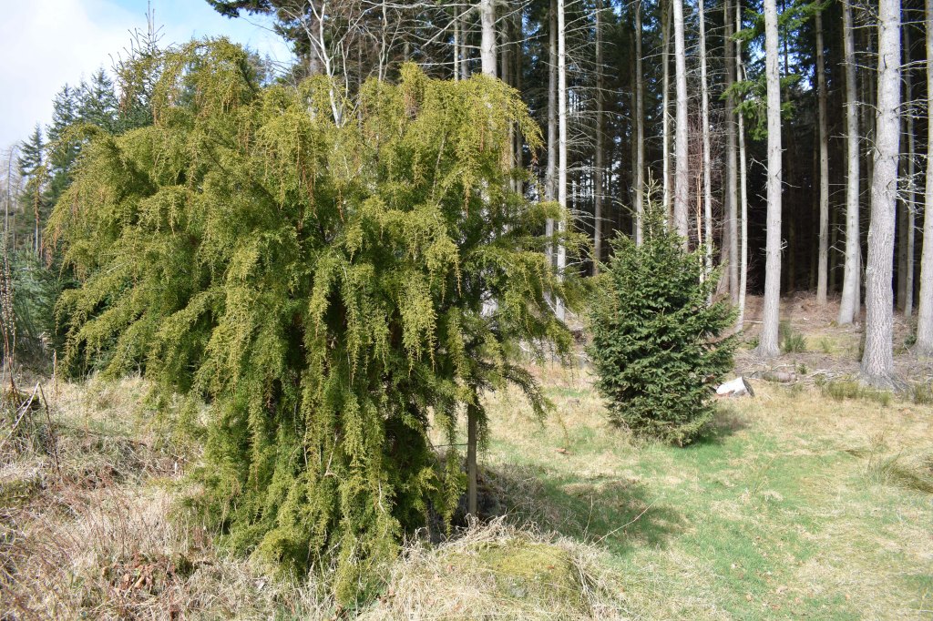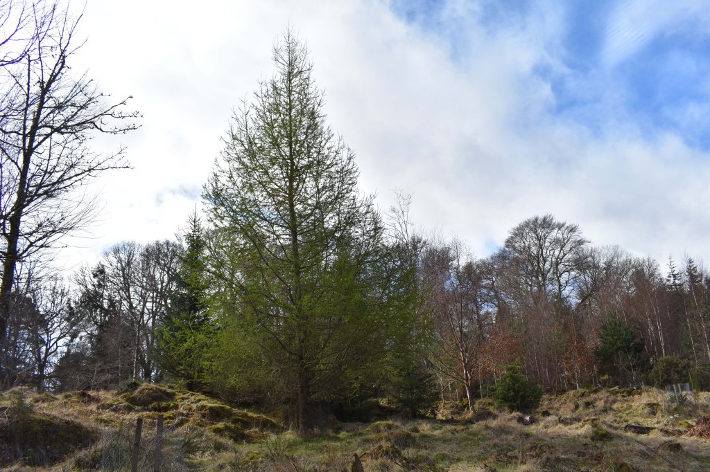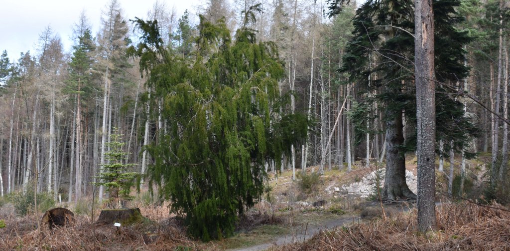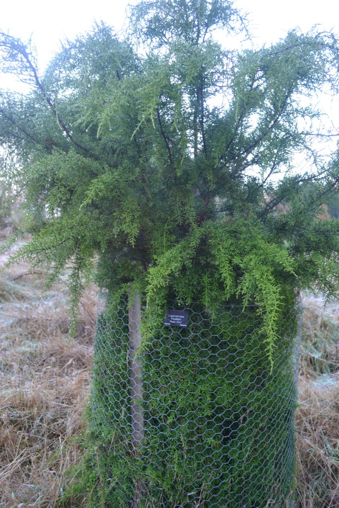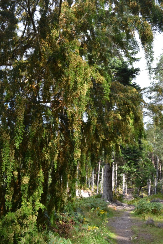 I took a turn down to the young pinetum because I wanted to check on how it had fared through the winter. The trees did not seem to have been affected by the frosts. I was particularly interested in the Huon pine, Lagarostrobos franklinii, from Tasmania. It is not really a pine, but a podocarp that grows in damp places by rivers. We have two of these Huon pines which are rare in Scotland. The older tree is part of Sir James Burnett’s now much depleted pinetum of the 1940s; the younger was planted in 2003. Both trees were looking fine. The young one is a very fine shape much improved since its protective cage was removed. Both trees bore female cones in 2017.