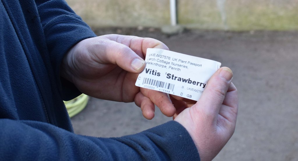 James was looking pleased as I entered the yard the other day. He was contemplating some newly delivered choice plants. The little conifer Pinus strobus ‘Minuta’ is destined for the Evolution Garden and the vines Vitis ‘Strawberry’ are to be planted against the Viewpoint fence. They will probably fruit, and in a good summer should ripen well. The name gives a hint of the flavour of the fruit; good autumn colour is another bonus. It’s all a bit of an experiment and part of the pleasure of gardening.