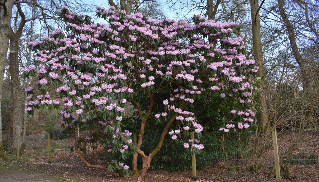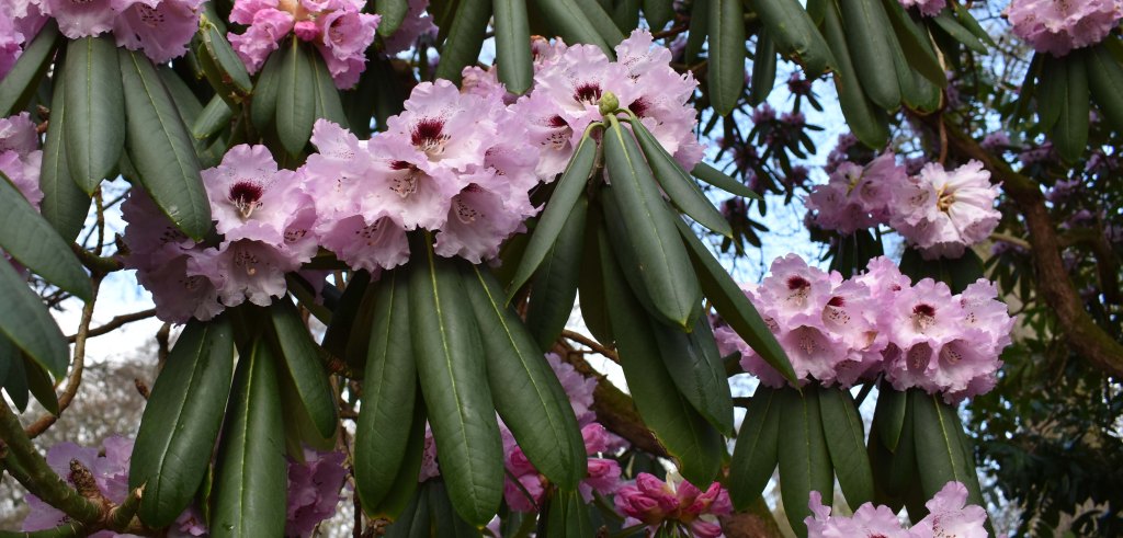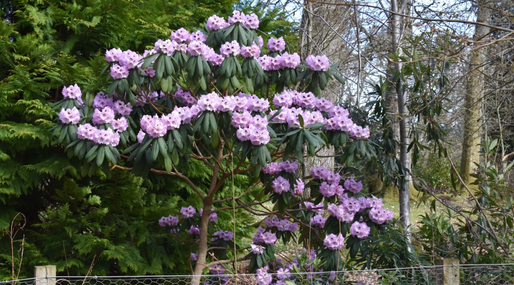 Across the road, beside the Woodland Garden, and in complete contrast, an eye catching rhododendron is in flower. A Facebook post from Scotland’s Garden Scheme Moray and Nairn suggests that it is Rhododendron calophytum.