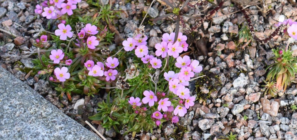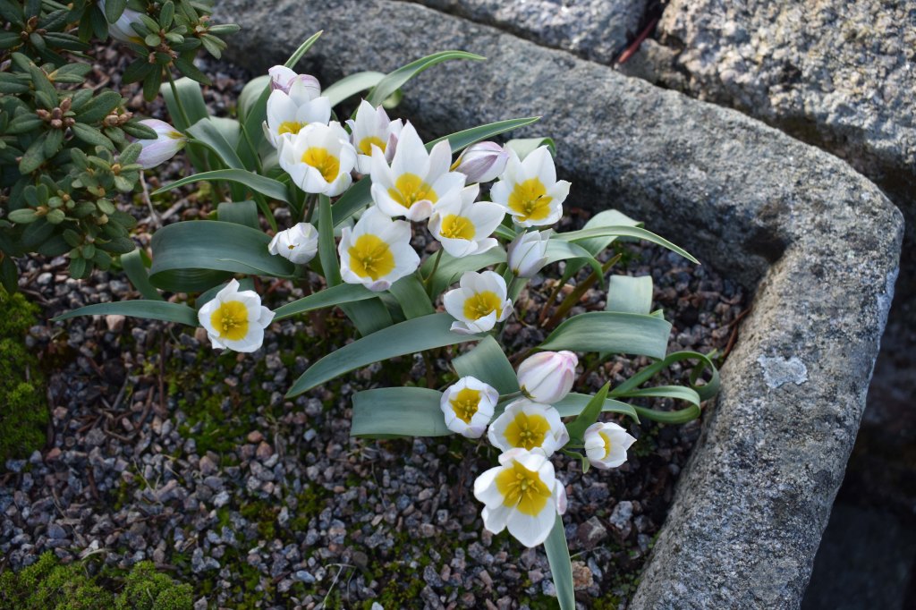 Also plus is a lovely tulip species, Tulipa polychroma, flowering in one of the stone sinks on the Aviary Terrace. Another pretty container plant in the Upper Pool Garden may be a saxifrage, but its label has disappeared.