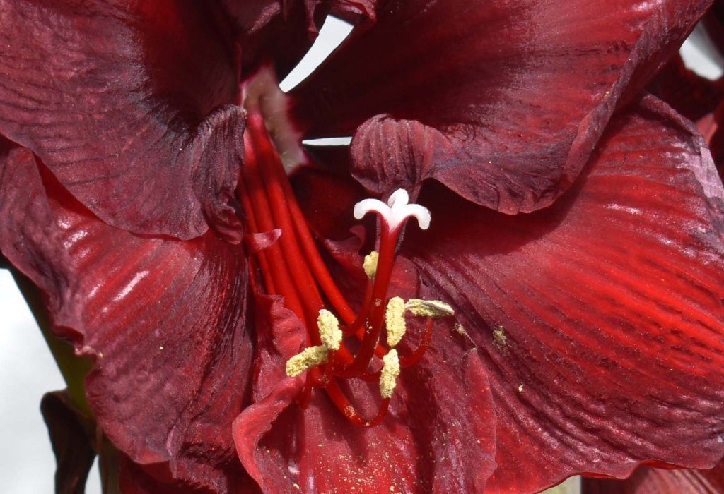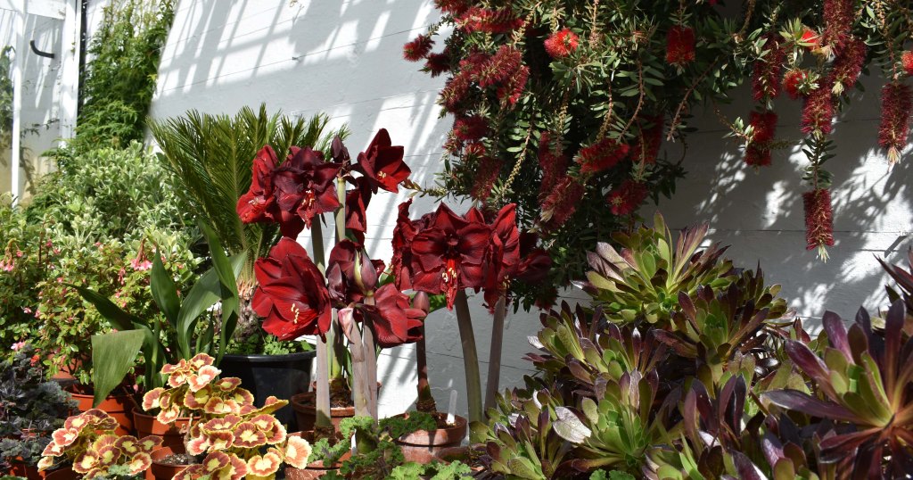 In the glasshouses I am seduced by Amaryllis ‘Grand Diva’. Voluptuous seems a good way to describe it. The dark red colour looks so good in front of the bottle brush, Callistemon citrinus.