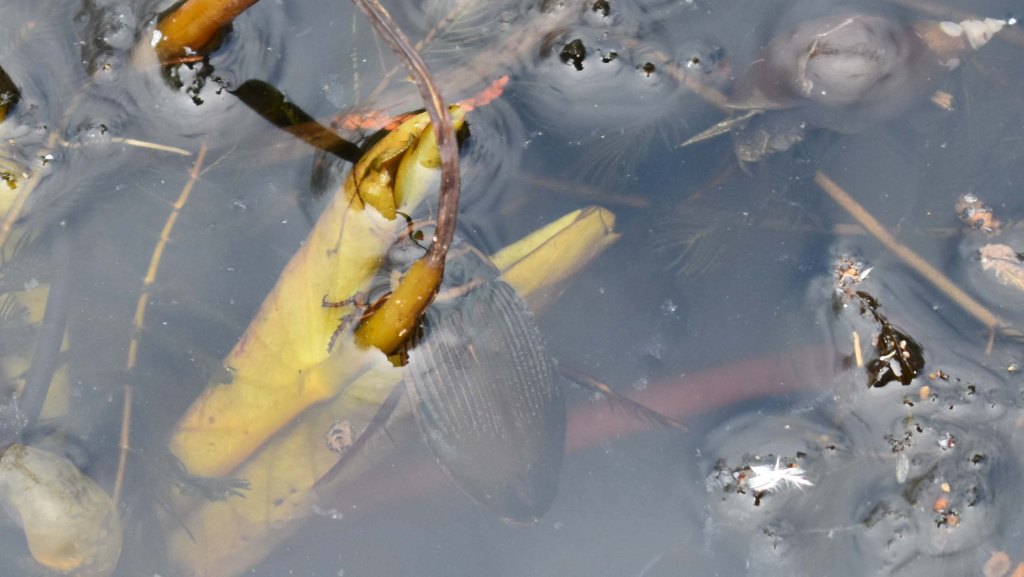 In the Woodland Garden I look for tadpoles. I can’t see any, but I do see a great diving beetle coming up for air, which it stores under its wing cases. It is a fearsome predator about 3cm long. Its presence shows that the pond has plenty of life; this beetle will certainly have been feasting on any tadpoles it can find. If it runs out of prey it will fly away to find another pond.