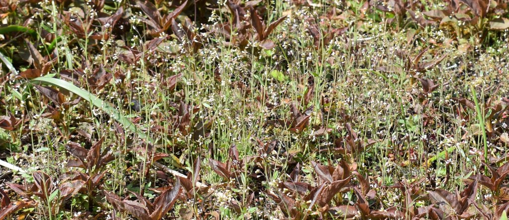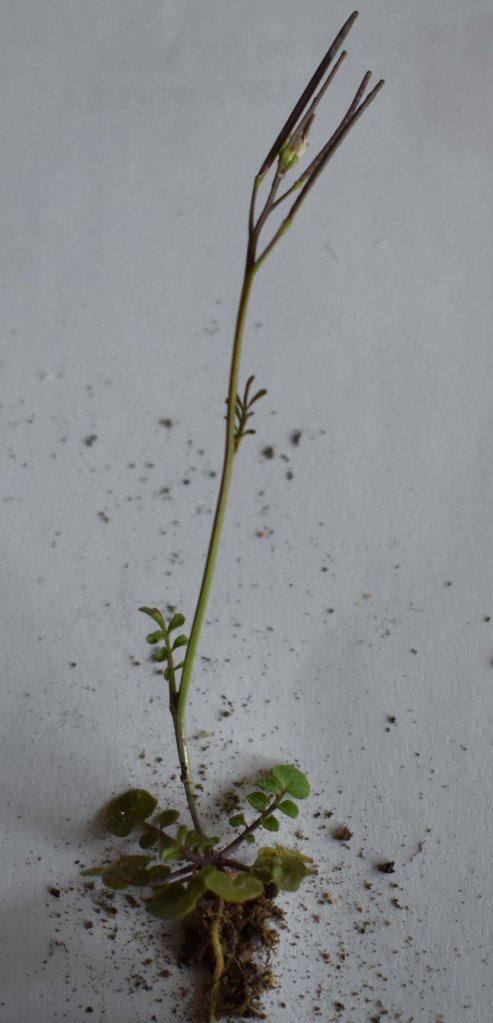 A week later Cecilia and Sandra (volunteer) are weeding in the Double Herbaceous Border. We discuss a tiny weed. Cecilia is adamant it is not hairy bittercress and we resolve to check it out. It turns out to be the closely related thale cress, Arabidopsis thaliana, common on disturbed land. The leaves of the basal rosette are entire and without the leaflets of the hairy bittercress, Cardamine hirsuta. Interestingly the thale cress is important in the study of genetics, its genome being known since 2000. It is the plant equivalent of the fruit fly drosophila, with a short and prolific life cycle. It might be important in the bigger picture, but it is a complete pest for Cecilia and Sandra as every tiny plant has to be hand picked, and there are thousands.