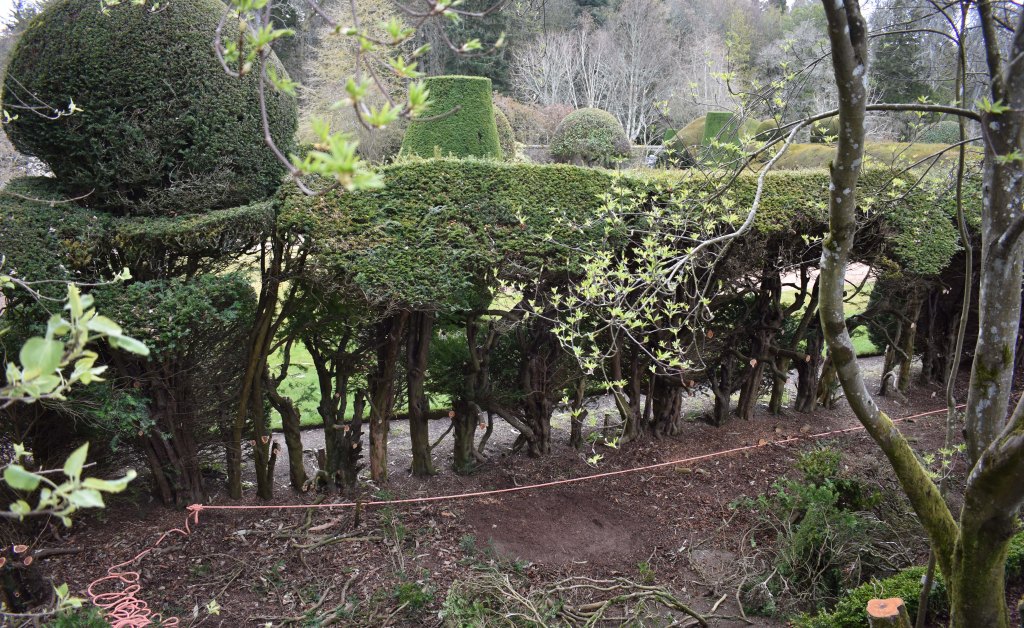 The exercise is not quite so shocking as previous cuttings because much of it is hidden from view in the main gardens, but the gaps seen from the Fountain Garden are now really pronounced. When they have finished, the gardeners will mulch what is left.