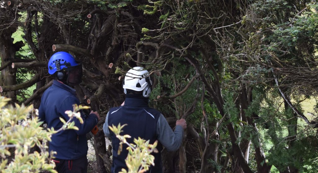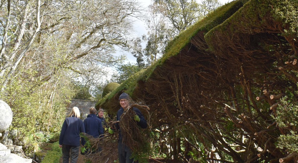 When I arrive on 28th April there is trailer full of yew branches at the East Gate and I know that the yew hedge project has begun. The large branches have already been chipped; the smaller branches are destined for the bonfire. The yew borders have been overshadowed by the hedges and the paths have been getting narrower by the year. The eastern side of the hedges were cut in 2006 and now the western side is being cut back hard. James wields the chain saw and he and Andy deliberate on which branches to cut. It’s more complex than it sounds because the branches are not regular – they twist and turn in unexpected fashion. There is also the problem of the gaps on the eastern side which never re-sprouted at the base after the previous cut. I gather that there will be some infilling with young plants. James and Andy wear hard hats and face shields to prevent damage from falling branches and to protect themselves from the stour of the disturbed yew. The team then need to remove all the branches.