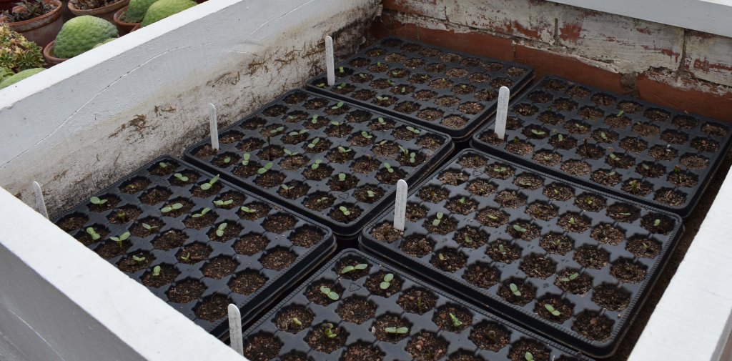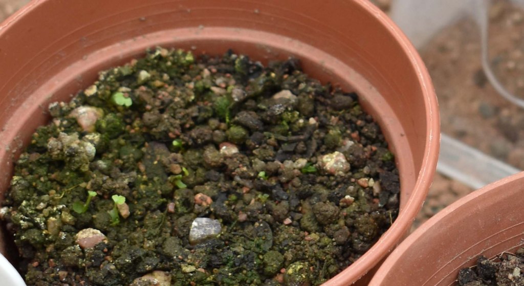 Evidence of coming pleasures is everywhere in the other houses: seeds of various helianthus germinating, cosmos, plugs of rudbeckia, nicotiniana, to mention a few. The tree ferns are also developing. I couldn’t see with the naked eye but when I zoomed in on the camera I could see the tiny prothallus with its sporophyte just emerging.