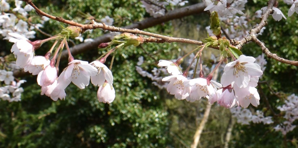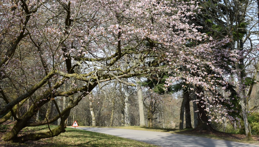 Finally, the geans – native cherries – are coming out on lower Deeside. And it’s official: April 2021 was the frostiest April on record. Aboyne, which is eight miles from Crathes, had 25 nights with below freezing temperatures. The blossom is not only late, in some cases it is less floriferous than last year. The Prunus incisa moerhemii never did get many flowers, but those near the East Lodge are lovely.