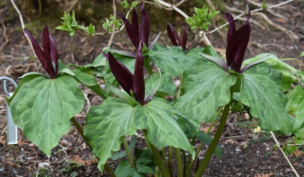 I thought I was sure of Trillium albidum on the Double Shrub Border, but then I looked at the one I photographed last month by the Doocot and it seems to key out as T. albidum as well, but the two don’t look the same. Hey ho. But the dark maroon one on the Double Shrub Border has a label – T. angustipetalum, and it matches the photograph (see top). I get into a muddle with others; the labels don’t seem to match the photographs. However, there is a newly planted trillium in the Evolution Garden with label Trillium recurvatum and it matches the photographs perfectly: sessile, recurved leaves/bracts that have a petiole (leaf stalk). Two down at least – many more to go.