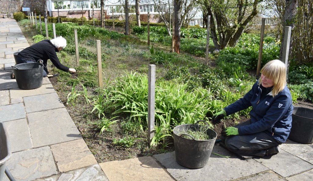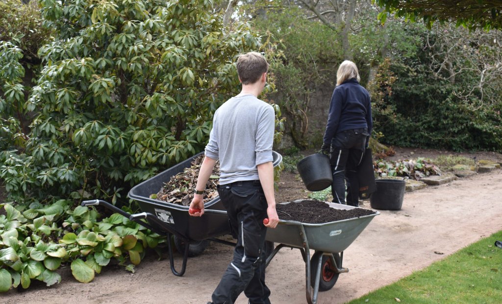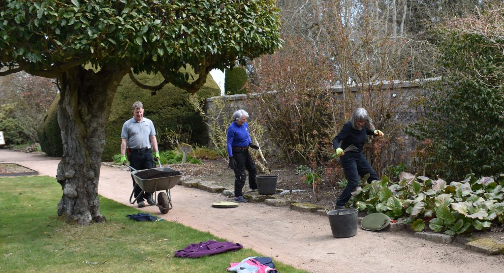 Weeding continues to be a priority. The Rose Garden east border gets the treatment from Cecilia and volunteers Janice and Sheila. As soon as they move on Steve and Tim are waiting to barrow on the compost – it’s Crathes compost, beautiful and crumbly.