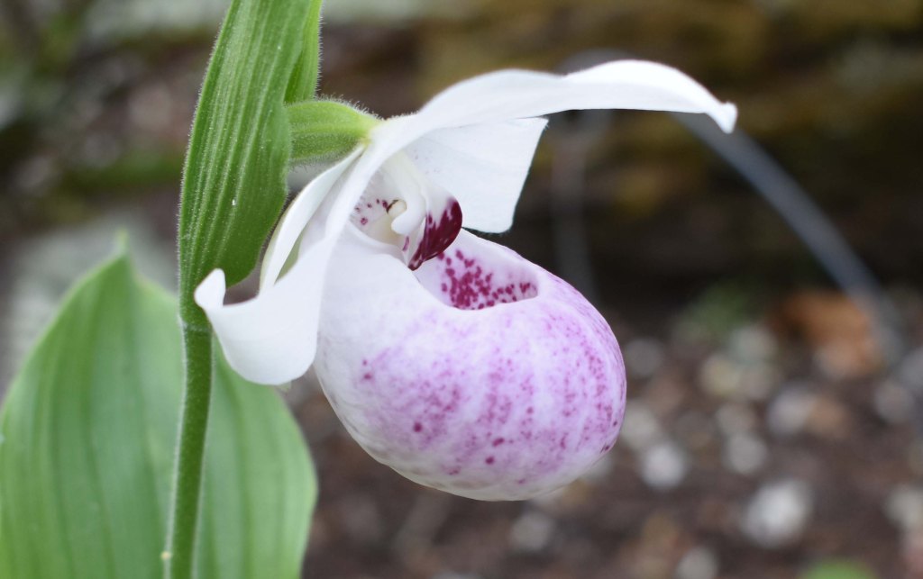 The Lady slipper orchid, Cypripedium ‘Ulla Silkens’, is a cross between the red American C. reginae and a yellow Russian/ Himalayan C. flavum.