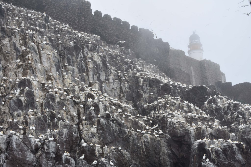 This year the Invasive Non-native Species week was held 24th – 30th May and by coincidence I was in North Berwick on 29th taking a trip round the Bass Rock and Craigleith, two islands just off the coast. The coincidence relates to SOS Puffin, a project involving the invasive tree mallow, Lavatera arborea, which has covered Craigleith. The mallow can grow to over six feet and its roots prevent the puffins making their burrows. The boat trip took place in thick fog and rough seas, but we did manage to see some puffins and lots of gannets.