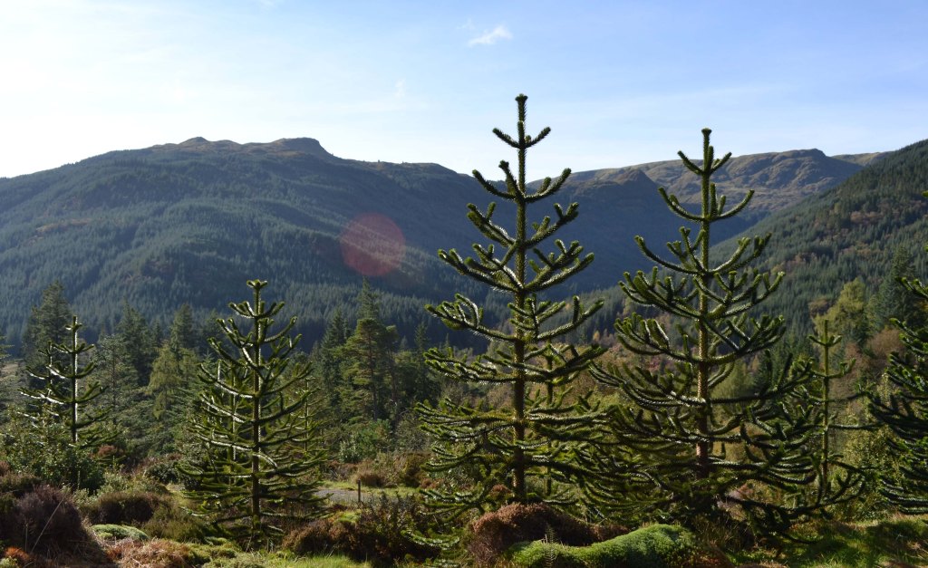 Reducing the diversity in the garden is not the answer to invasive plants. Our gardens would be so much poorer if we only grew native plants. Furthermore Crathes, in a small way, helps in an international context. The Royal Botanic Garden of Edinburgh (RBGE) plays an important role in global conservation, holding living collections of plants, such as the endangered monkey puzzle trees, Araucaria araucana, and Fitzroya cupressoides, both from Chile and Argentina. Crathes and many other estates in Scotland hold some specimens of the many endangered plants of the world as a safeguard from local dangers such a wildfires or disease which might hit the RBGE collections. The young arboretum at Crathes has a few such plants.