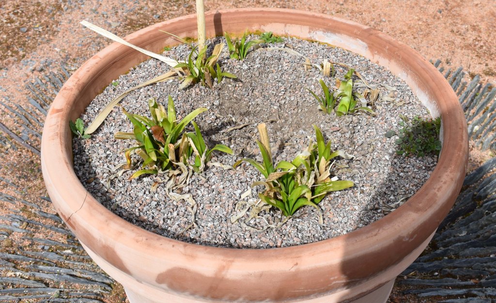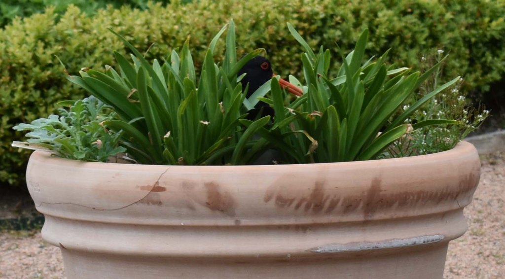 I am pleased to see that there is evidence of more mining bees in the Fountain Garden. Although I didn’t actually see any bees, they leave a pile of grey dust where they have pushed up through the red surface of the path. What is did see was the oyster catcher. I nearly missed it sitting in the middle of the agapanthus pot. Oyster catchers often try to breed in the garden, usually without success. I had noticed the scrape earlier and wondered; Cecilia tells me there are three eggs. The camouflage afforded by the growing agapanthus will maybe project the eggs from crows, but how will the chicks fare when they hatch? If they fall off the pot without harm and move quickly into some vegetation they may well survive. Fingers crossed.
