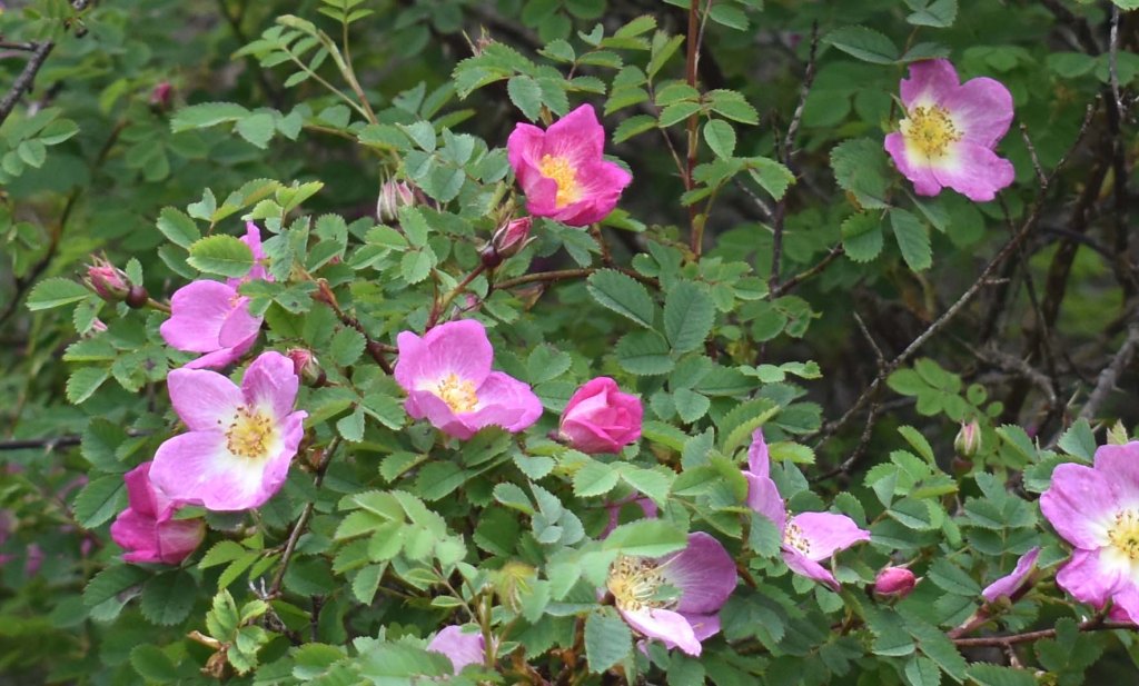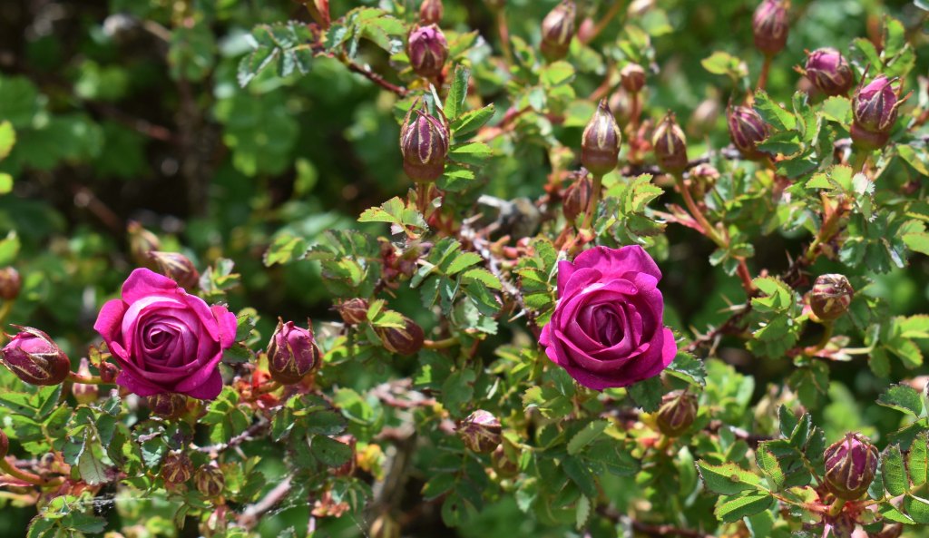 Rosa pimpinellifolia ‘Glory of Edzell’ came from an Edzell garden in Angus, and is the first rose to bloom at Crathes. Scottish nurseries derived a large variety of cultivars from the burnet rose which is common in Europe and parts of Asia. Many Scots roses have lost their names but survive in old cottage gardens. They are just coming out in the Rose Garden, but there are roses all over the garden and July is probably the best month for rose addicts to visit.