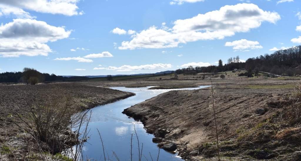 The landscape looks raw after the restoration of the Beltie Burn, 12 April 2021.