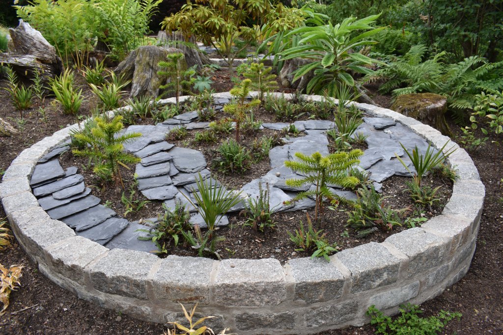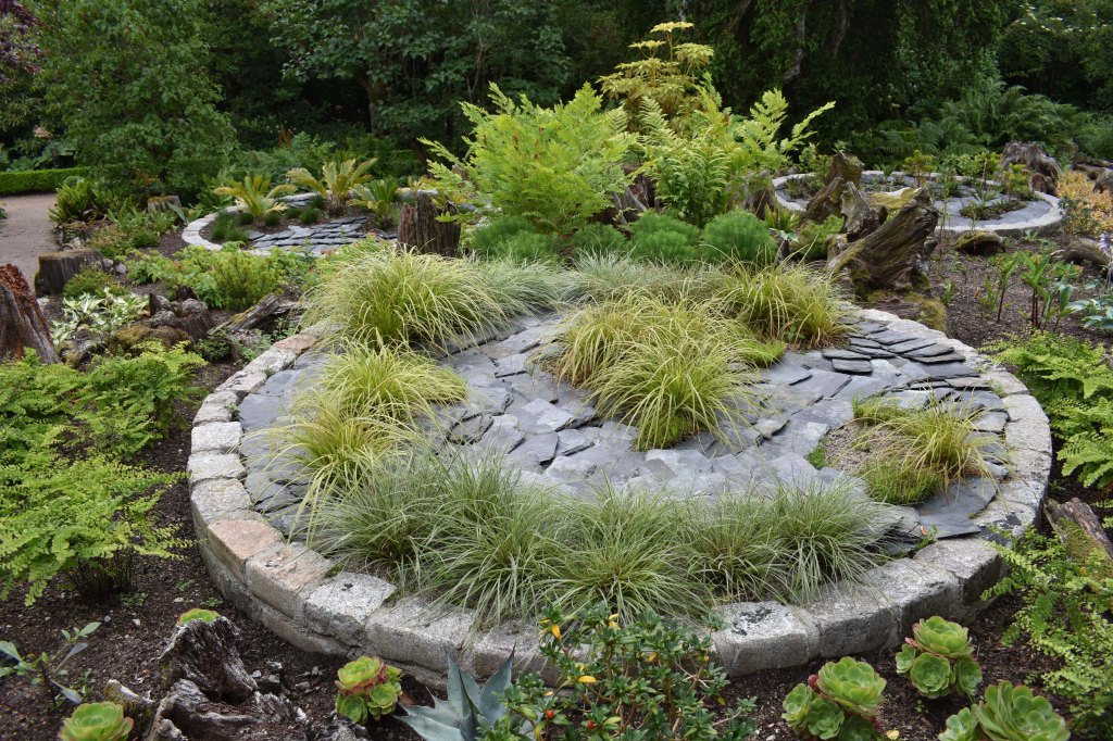 The Evolution Garden at Crathes is finally completed – in so much as a garden is ever completed. The triangular piece of garden between the June Border and the Doocot Border was for many years used as a nursery for cardiocrinums, but by the end of the last century the lilies were not doing very well and the area became a Learning Garden. Different themes were trialled usually for three years. Vegetables came first then pollinators, and when James took up post in October 2017 the theme chosen by Chris Wardle (our previous head gardener) was evolution. James took time to decide on action – evolution after all is a – the – big theme. Eventually he decided that such a garden merited a lot of effort and should be longterm. The space was small, but cool and enclosed and could easily incorporate part of the Doocot Border. It would fit in with the idea of Crathes ‘rooms’, but would also go along with the Burnetts’ cutting edge approach; Sir James and Lady Burnett had always looked for originality and excitement in their gardening. Whilst it was not against the ethos of the garden it gave James some freedom to be creative. He decided that there would be three raised circular beds depicting different geological periods containing some of the relevant plants. The planting outside the beds would not be time-themed as that would constrict the final effect. Every plant tells a story and so a variety of plants would make for interest, especially if they were unusual, maybe living fossils or evolutionary curiosities.