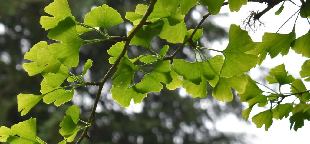 Ginkgo biloba, another primitive gymnosperm sometimes called a living fossil, grows in the Woodland Garden, 29 June 2021.