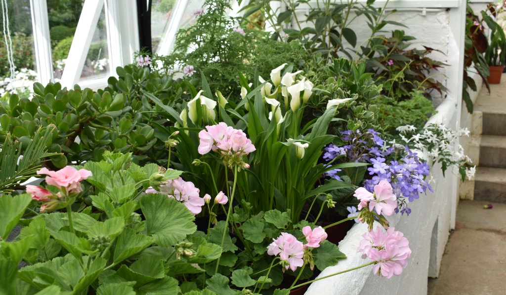 The tree ferns, Dicksonia antarctica have spent the winter inside. Because they are young they don’t yet look like ‘trees’. They are ferns, not trees, but will eventually grow tall if they thrive. This is another experiment for James because, like the cycads, the tree ferns will need to take their chance in the winter, although they will be given some protection. One of the baby tree ferns in the glasshouse that Joanna has been nurturing is now looking more like a young fern.