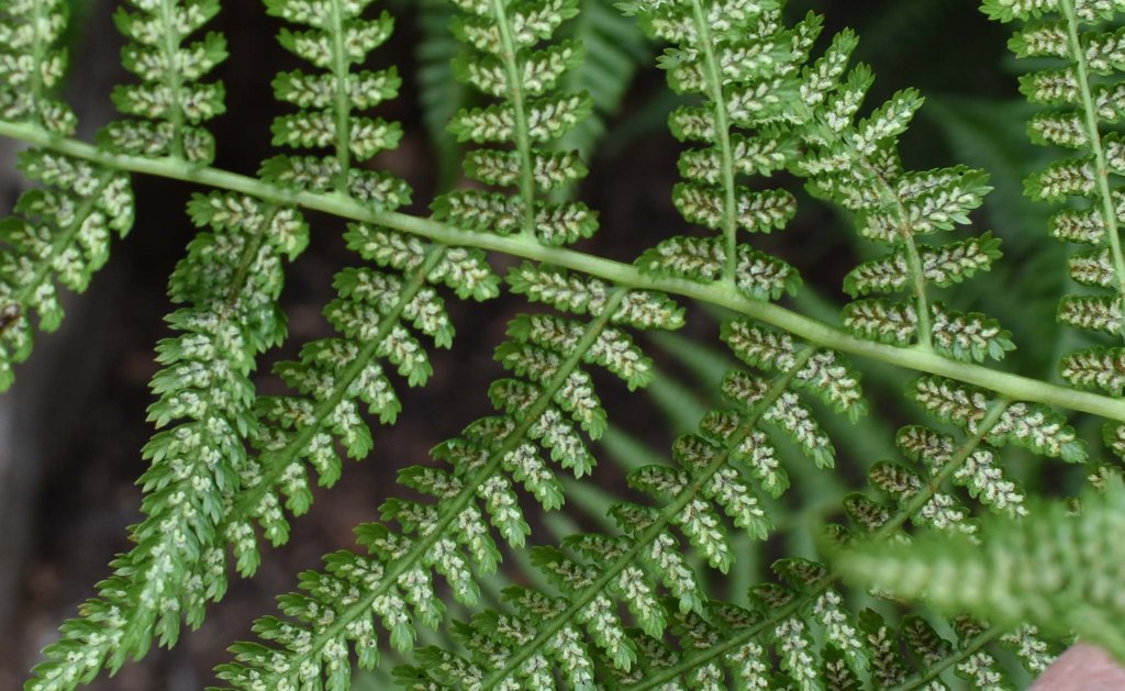 J-shaped sporangia containing spores on the underside of the native lady fern, Athyrium filix-femina, 12 July 2021.