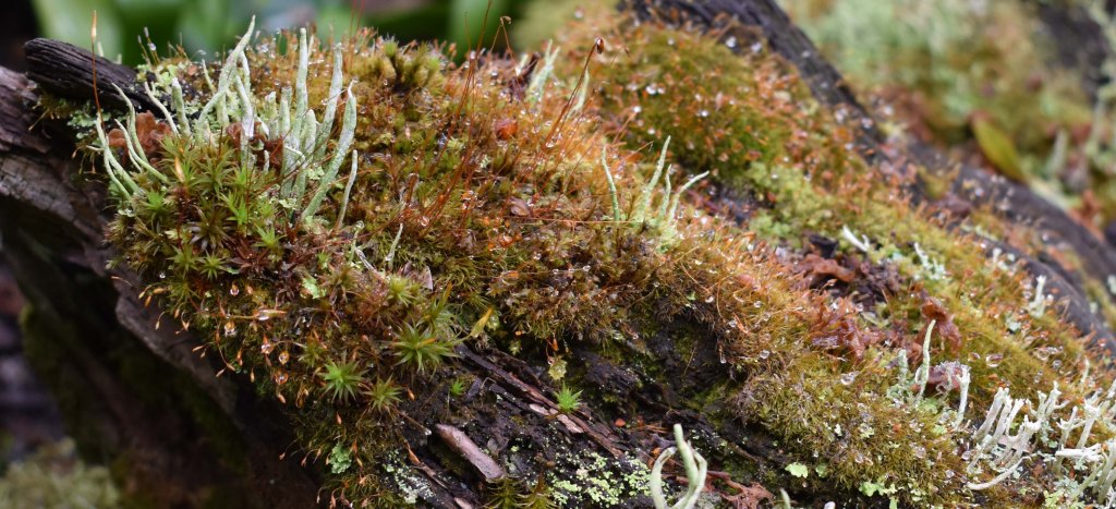 Mosses and their spore capsules, much shrivelled after the drought. The blue grey stems are lichens. 6 July 2021.