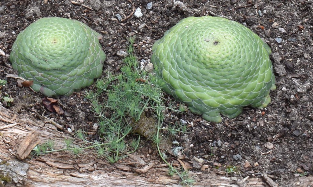 Two plants native to Tenerife: the succulent Aeonium tabuliforme and feathery Lotus berthelotii, 30 June 2021.